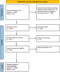 After applying these filtering criteria, the final merged dataset consisted of 928 articles from Scopus and 50 articles from WoS. In total, 978 documents were included in the analysis for this study (see Figure 1).